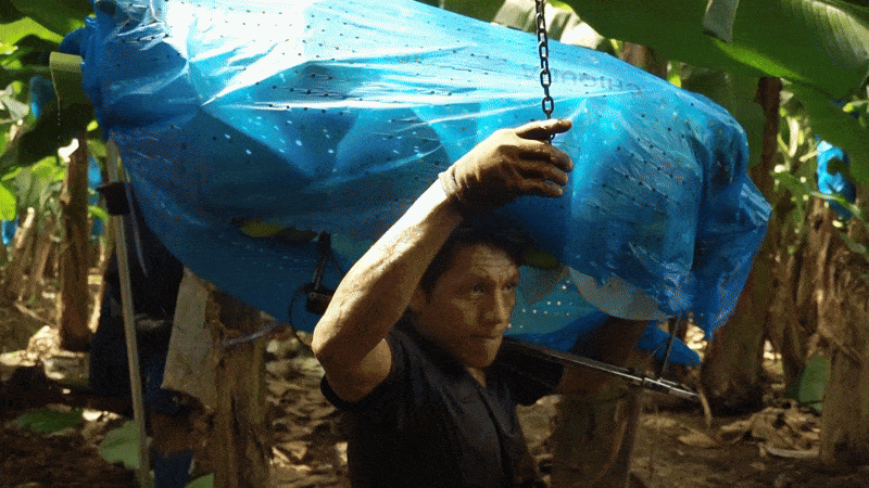 A young worker cuts banana bunches without protective equipment on a transnational plantation.